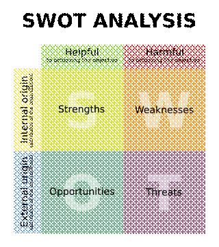 SWOT Analysis, is a strategic planning tool used to evaluate the Strengths, Weaknesses, Opportunities, and Threats involved in a project or in a business venture.
