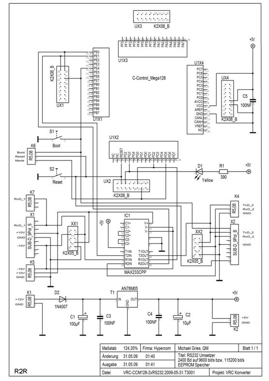Der VRC-Konverter kann über die zweite RS-232 Schnittstelle mit neuer Software geladen werden. Damit dies auch von „entfernter“ Stelle (bis ca. 10m) mittels Laptop möglich ist wurde ein spezielles Bootcable entwickelt, dass direkt zwischen Verbindungskabel und Laptop zwischengeschaltet wird. Es besitzt in den Stecker integrierte Schalter zum Rücksetzen (Reset) und Booten (Boot) des C-Control Mega128 Bausteins.