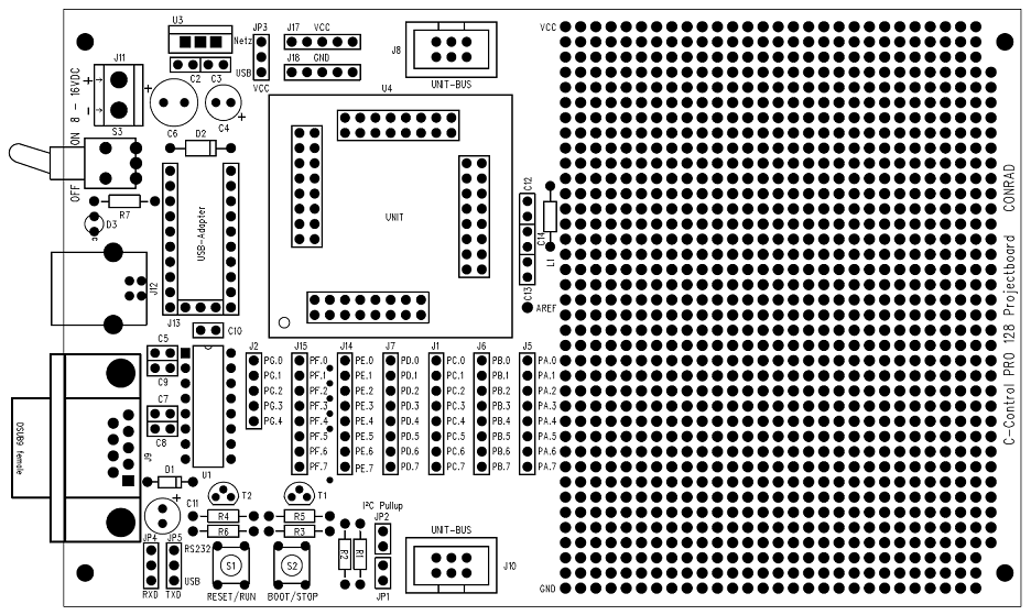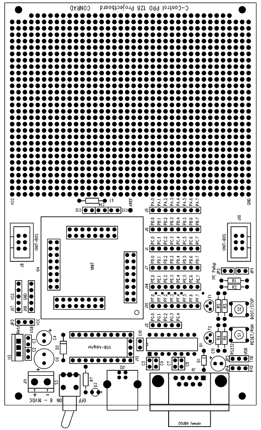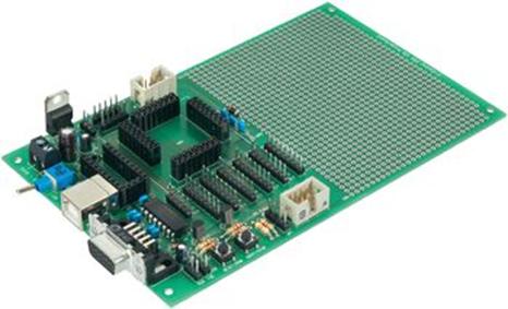 Als preisgünstigen Einstieg wird das folgende Projectboard für die Prototypen-Erstellung angeboten. Conrad-Artikelnummer: 197313 -xx (Preis 03/2009: 14,95€)